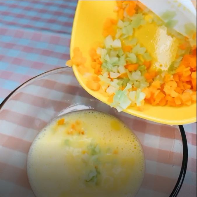 雞蛋攪打均勻,碗內(nèi)倒入包心菜、胡蘿卜和寶寶米粉