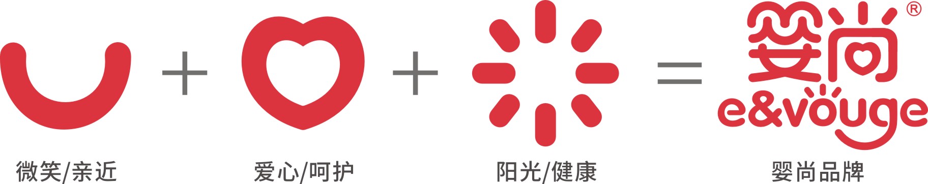 笑臉、愛心 、太陽三個(gè)輔助元素代表了嬰尚要傳遞給消費(fèi)者的三個(gè)價(jià)值觀:陽光(活力)、快樂、愛(分享)。