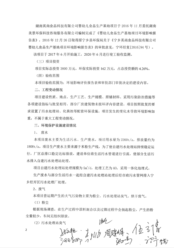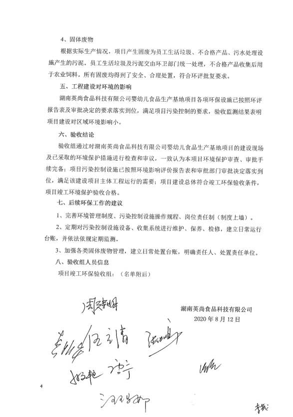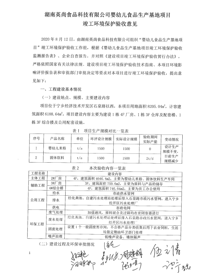 湖南英尚食品科技有限公司嬰幼兒食品生產(chǎn)基地項(xiàng)目竣工保護(hù)環(huán)境驗(yàn)收意見