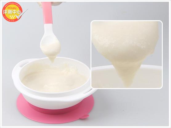 1、用輔食勺舀起沖調(diào)好的米粉,緩緩向下傾倒,觀察其粘稠度。