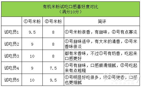 編輯沖調(diào)好嬰尚有機米粉與品牌A有機米粉,分別命名為①號和②號,邀請5位試吃員進行試吃。從試吃員反饋的情況來看,①號米粉較香甜,且有奶香味,更細膩,吃起來味道更好,②號有機米粉則口味比較寡淡,口感也不如①號細膩。最后,①號(嬰尚有機米粉)以47.5分的總分擊?、谔枺ㄆ放艫有機米粉)的41分,口感完勝。