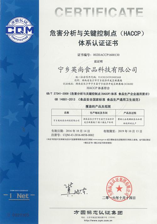 和食品HACCP體系認(rèn)證證書(證書編號:002HACCP1600130)。